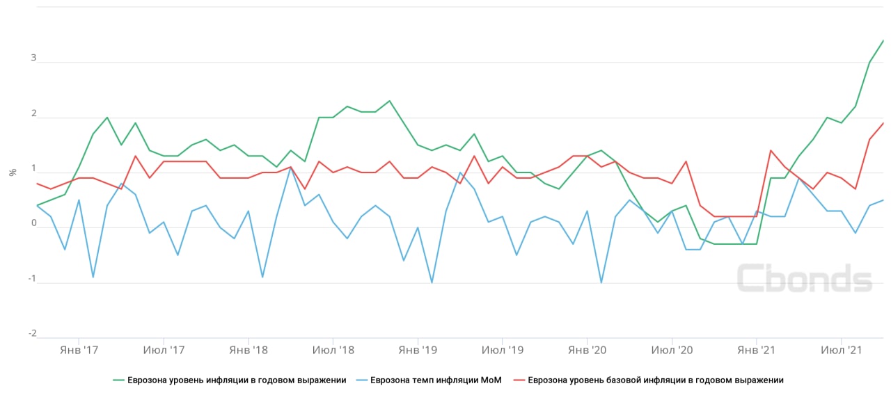 Годовая инфляция в 19 странах еврозоны в сентябре ускорилась до 3,4% с 3% по итогам августа. Это рекордный темп роста потребительских цен с сентября 2008 года.
