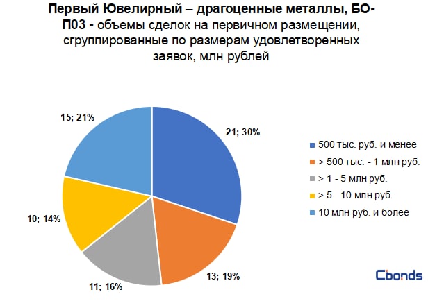 Наибольшую долю в структуре размещения (30%) заняли сделки объемом 500 тыс. рублей и менее, на втором месте идёт сделка объемом 15 млн рублей (21%).