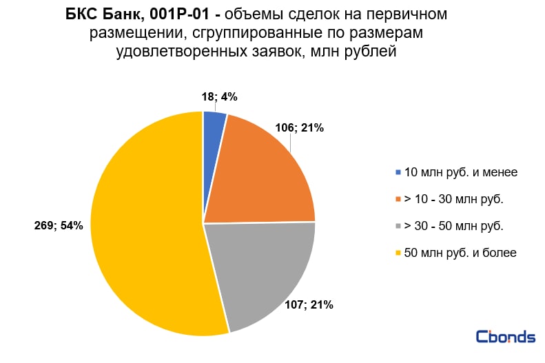 Наибольшую долю в структуре размещения (54%) заняли сделки объемом 50 млн рублей и более, на втором месте с равными долями идут сделки объемом от 10 до 30 млн рублей и от 30 до 50 млн рублей(21%).