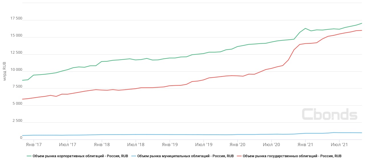 По итогам октября 2021 года объем внутренних корпоративных облигаций России составил 17 033.01 млрд рублей. По сравнению с сентябрем объем рынка увеличился на 1.63%. Месяцем ранее (в сентябре относительно августа) наблюдался прирост в размере 1.06%. Год назад, по итогам 10 месяцев 2020 года, объем рынка корпоративных облигаций России составлял 14 697.99 млрд рублей – показатель вырос на 15.89%. При этом с начала 2021 года (относительно 16 284.7 млрд рублей на 31 декабря 2020 года) произошел рост на 4.6%.