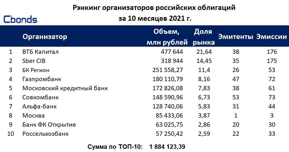 🔝🇷🇺Рэнкинг организаторов российских облигаций по итогам 10 месяцев 2021 года