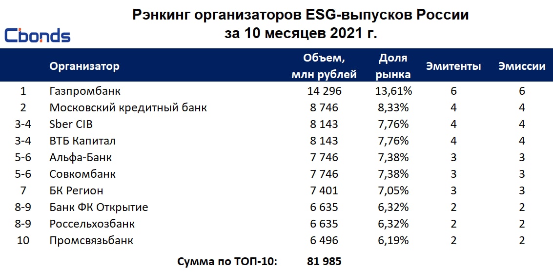 🇷🇺🍏Рэнкинг организаторов ESG-выпусков России по итогам 10 месяцев 2021 года