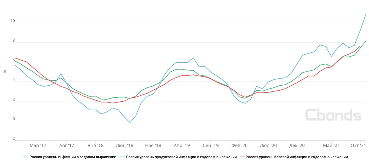 💬На данный момент значение существенно превышает уровень консенсус-прогноза Cbonds, согласно которому максимум ИПЦ по итогам 4-го квартала года – 7%, минимум – 5.5%, а среднее значение – 6.32%.