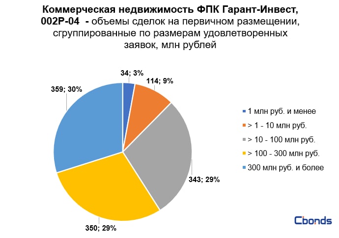 Наибольшую долю в структуре размещения (30%) заняла сделка объемом 358.6 млн рублей, на втором месте с равными долями идут сделки объемом от 10 до 100 млн рублей и от 100 до 300 млн рублей (29%).