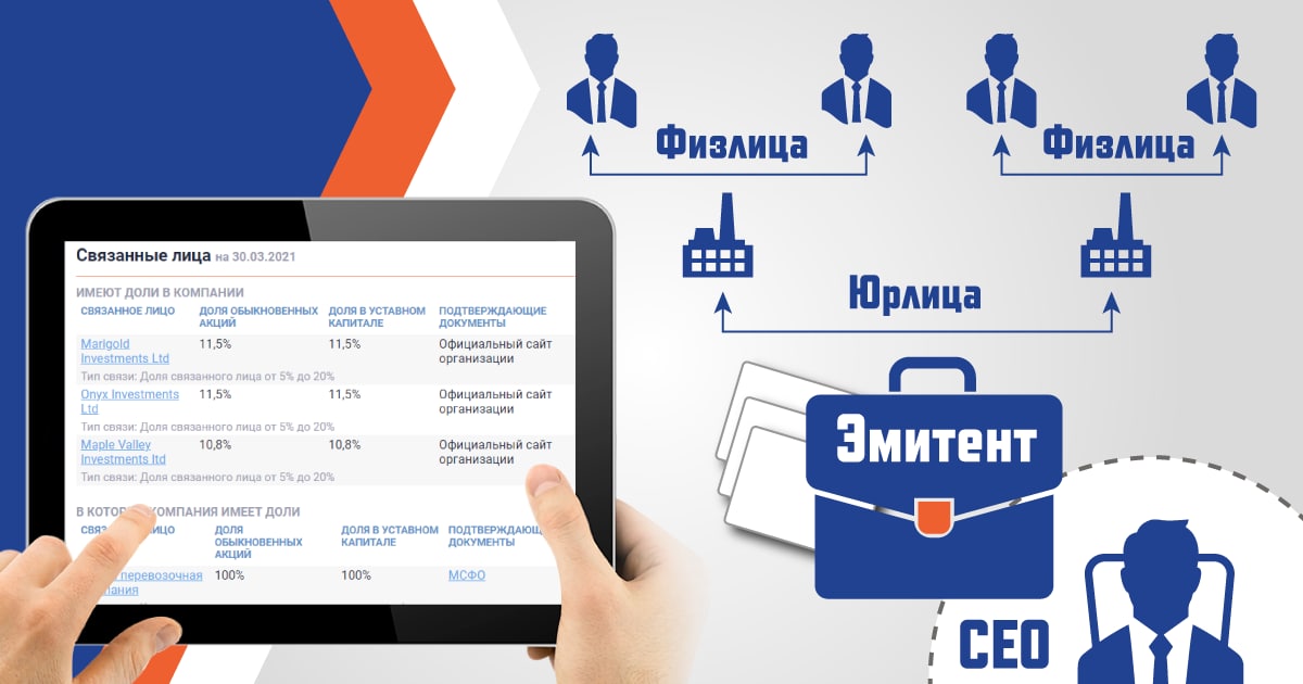 ✅ Информация содержится в блоке «Связанные лица» в левом нижнем углу страницы эмитента и включает название связанной компании, долю в уставном капитале эмитента, а также подтверждающие факт владения документы. Данные включают цепочку всех промежуточных владельцев и позволяют найти конечных бенефициаров компании.