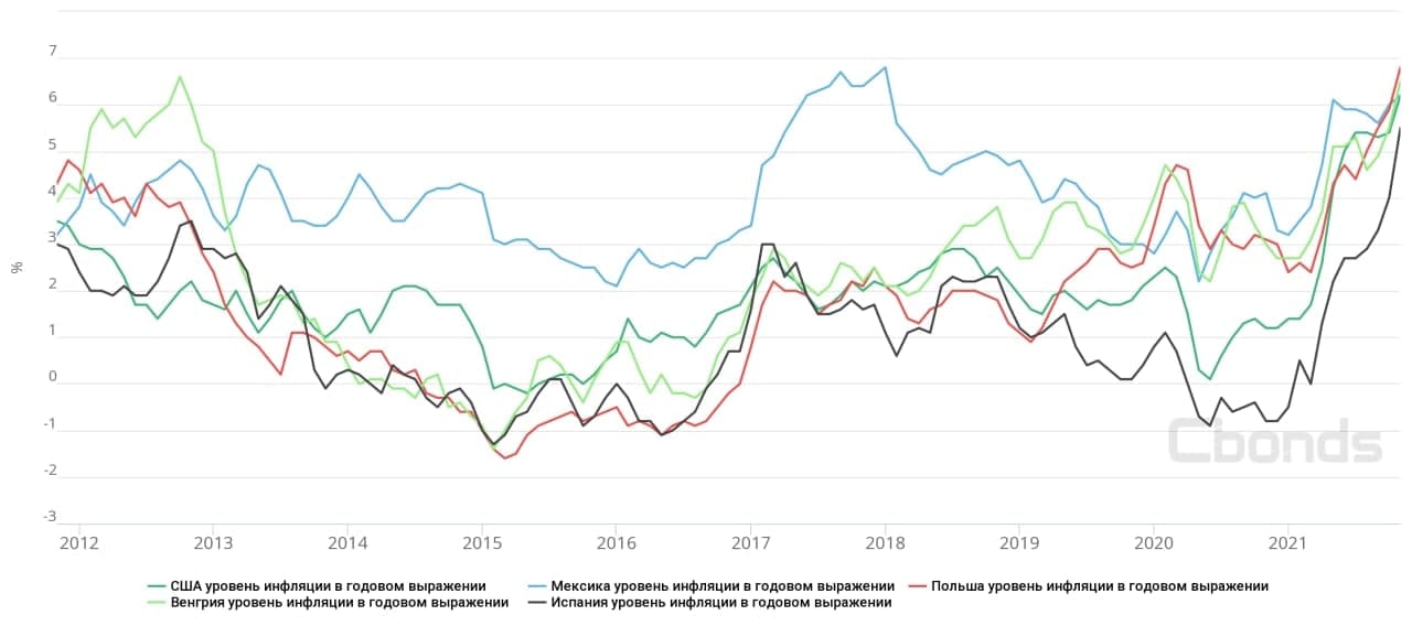 ❗️Общая инфляция в США – самая высокая среди развитых стран в этом году! На втором месте в октябре с «пятёркой» в % годовых была Испания – поэтому мы сравним с развивающимися рынками. Уровень инфляции в США равен Мексике, близок к Мозамбику – 6.4%, Польше – 6.8%, Венгрии - 6.5% Тунису – 6.3%. Из данного списка развивающихся стран в Польше, Венгрии и Мексике придерживаются политики инфляционного таргетирования. В обеих странах центробанки повышали свои ставки несколько раз. В отличии от ФРС, которая уменьшила объём покупки активов.
