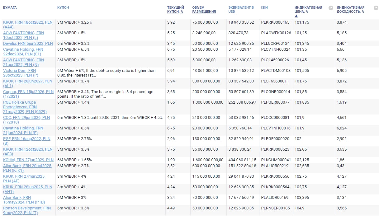 На текущий момент на нашем сайте представлены около 500 корпоративных облигаций с плавающей ставкой по Восточной Европе, основная часть приходится на выпуски эмитентов из Польши и Чехии, практически 85% от общей суммы.