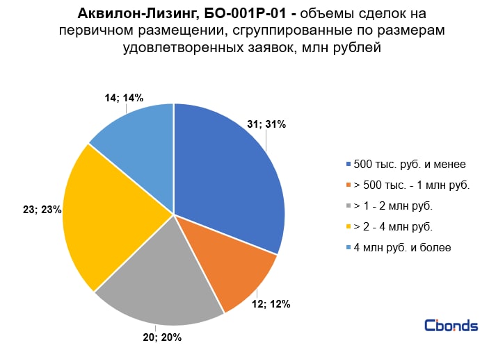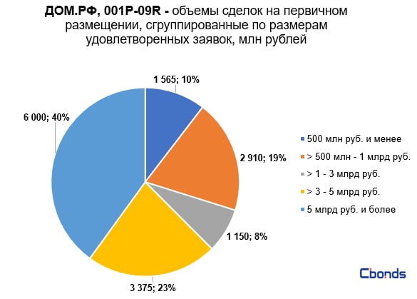 Наибольшую долю в структуре размещения (40%) заняла сделка объемом 6 млрд рублей, на втором месте идёт сделка объемом 3.4 млрд рублей (23%).