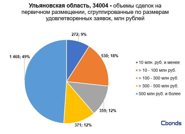 Наибольшую долю в структуре размещения (49%) заняли сделки объемом 500 млн рублей и более, на втором месте идут сделки объемом от 10 до 100 млн рублей (18%).