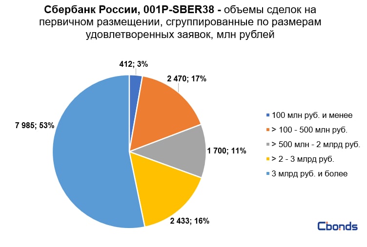 Наибольшую долю в структуре размещения (53%) заняли сделки объемом 3 млрд рублей и более, на втором месте идут сделки объемом от 100 до 500 млн рублей (17%).