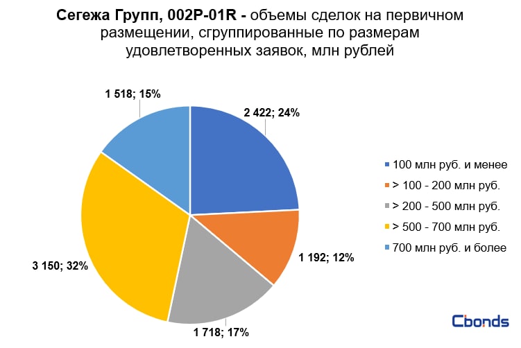 Наибольшую долю в структуре размещения (40%) заняла сделка объемом 6 млрд рублей, на втором месте идёт сделка объемом 3.4 млрд рублей (23%).