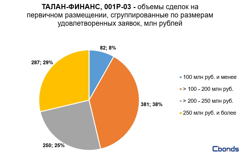 Наибольшую долю в структуре размещения (38%) заняли сделки объемом от 100 до 200 млн рублей, на втором месте идёт сделка объемом 287 млн рублей (29%).