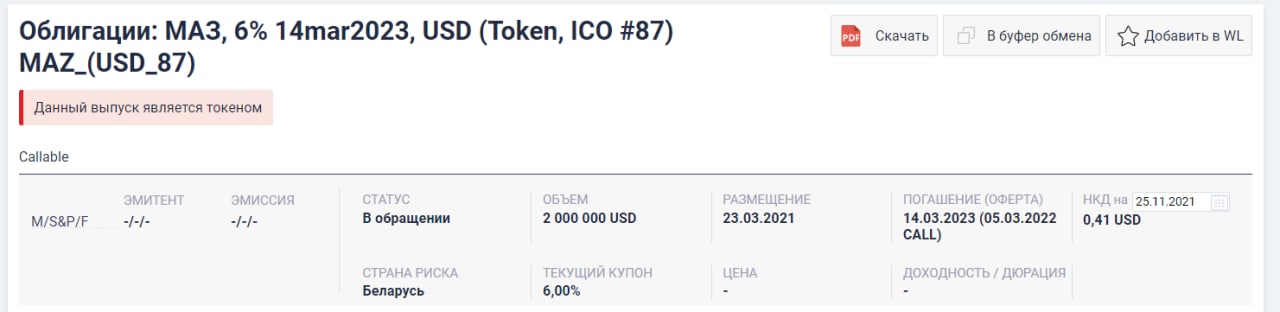 - МАЗ, 6% 14mar2023, USD (Token, ICO #87);