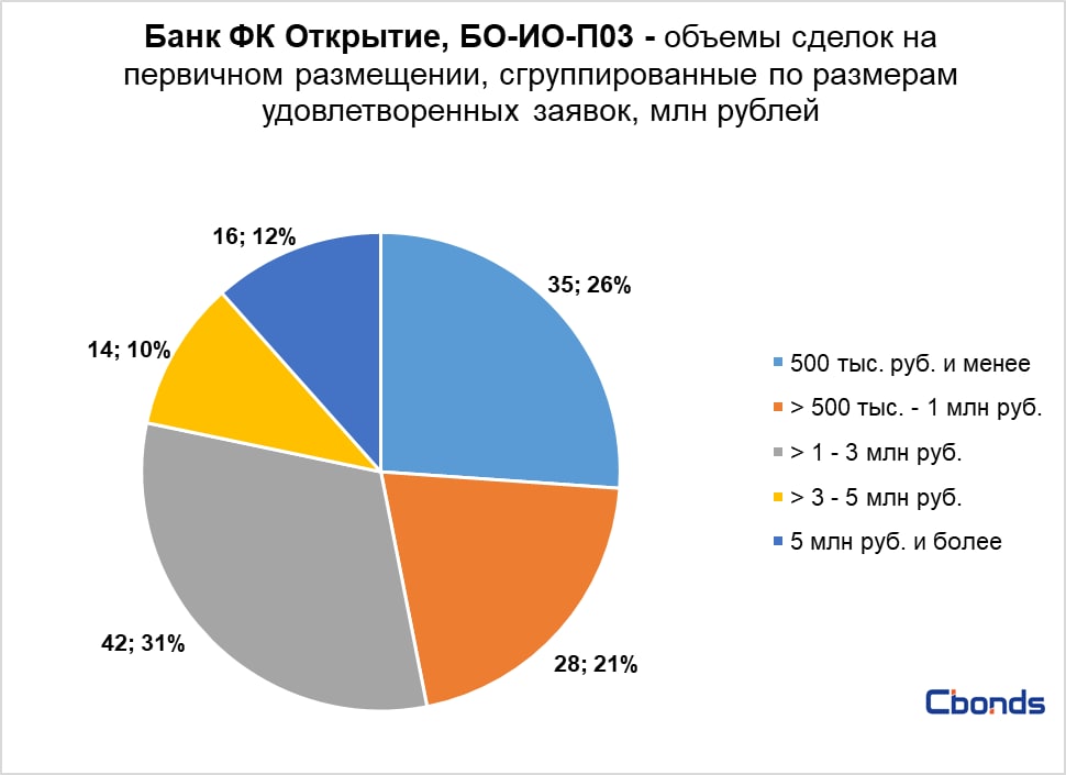 Наибольшую долю в структуре размещения (31%) заняли сделки объемом от 1 до 3 млн рублей, на втором месте идут сделки объемом 500 тыс. рублей и менее (26%).