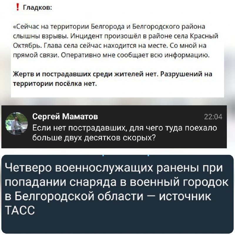 Поки що, на жаль, офіційно повідомляють, що четверо військовослужбовців РФ поранено при попаданні снаряда у військове містечко в Білгородській області.