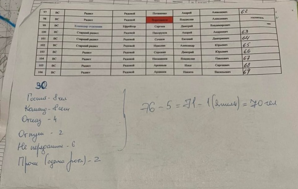 Судячі з документів, до 50% особового складу складали срочники. Проте 12 березня після великих втрат срочників та пресконференції, де полонені російські срочники спростували брехню Путіна від відсутності таких військовослужбовців в Україні, срочників з 59-го полку відправили до РФ. Списки особового складу, зв'язок, офіцери – все це в руках українських військових у повному обсязі!