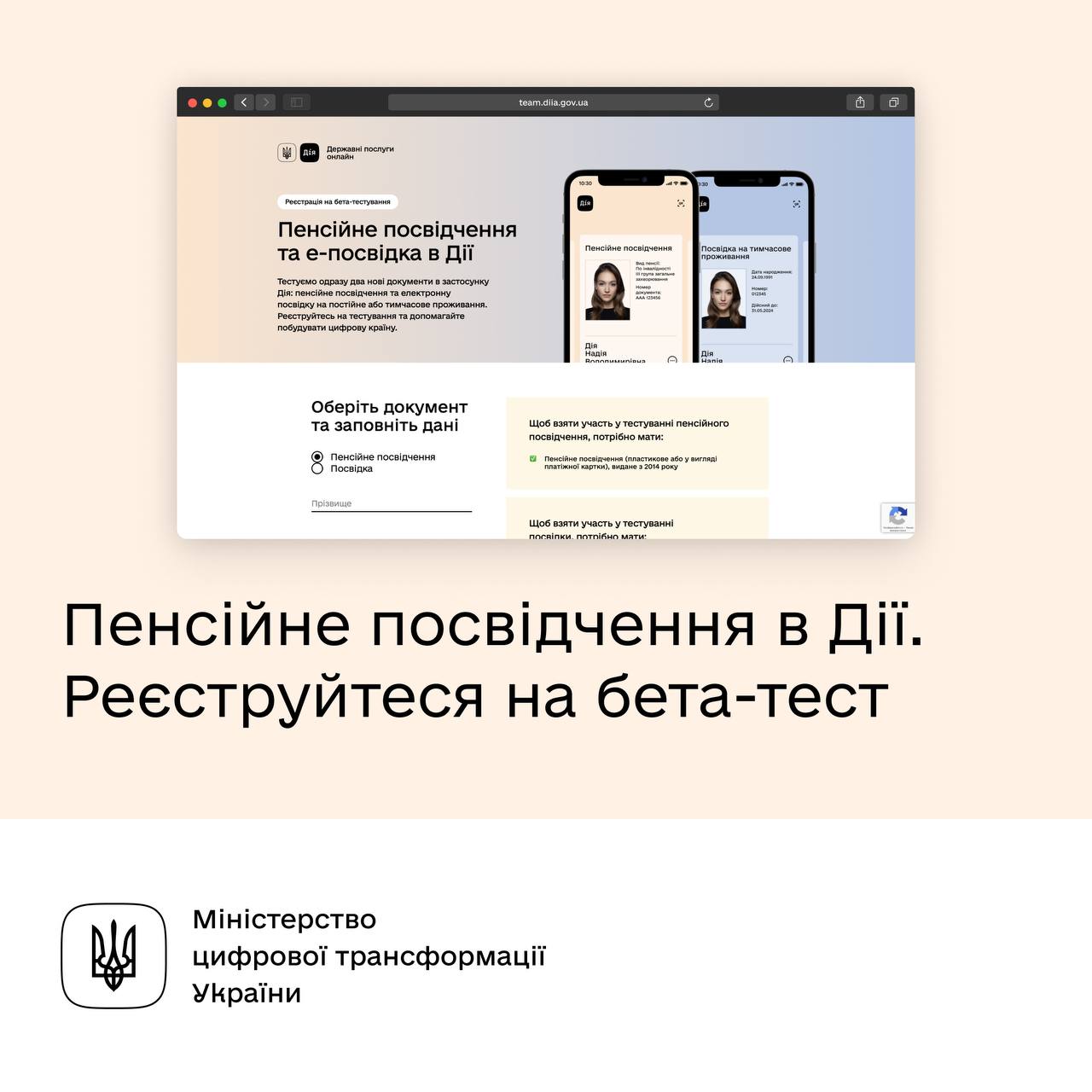 Міністерство цифрової трансформації України запускає бета-тестування у застосунку "Дія" пенсійного посвідчення та посвідки на тимчасове або постійне проживання.