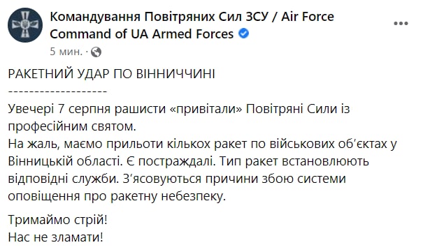 ⚡️ Командування Повітряних Сил ЗСУ повідомляє про ракетні удари по Вінниччині увечері 7 серпня