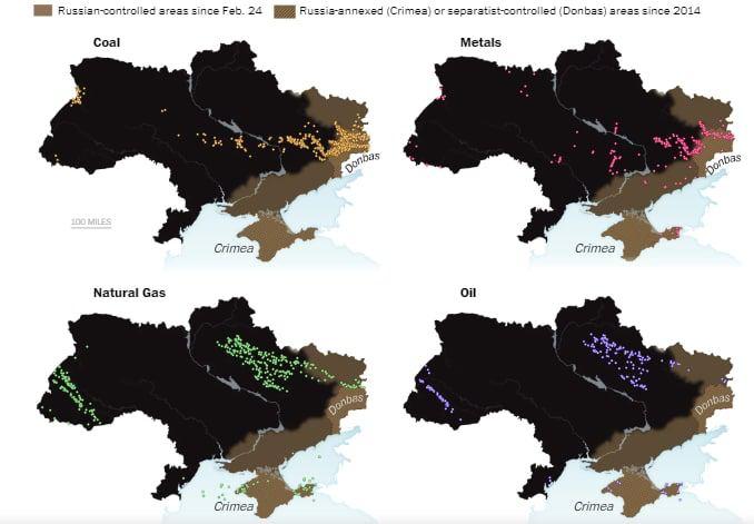 Як зазначає видання, зараз на контрольованих Росією територіях знаходиться 63% вугільних родовищ України, 11% родовищ нафти і 33% родовищ важливих корисних копалин, враховуючи літій.