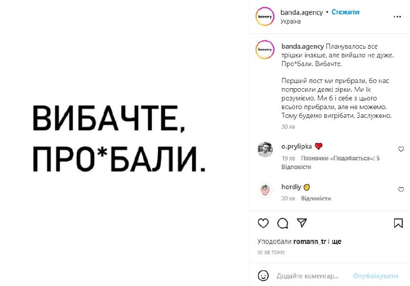 🤷♂️ "Про*бали. Вибачте". Креативна агенція Banda визнала недоречність запропонованого ними жесту