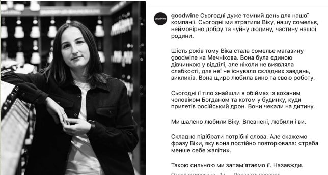 "Шість років тому Віка стала сомельє магазину goodwine на Мечнiкова. Вона була єдиною дівчинкою у відділі, але ніколи не виявляла слабкості, для неї не існувало складних завдань, викликів. Вона щиро любила вино та свою роботу... Ми шалено любили Віку. Впевнені, любили і ви", - написали в Goodwine.