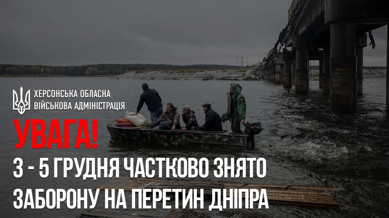 З 3 грудня (субота) по 5 грудня (понеділок) українці, які знаходяться на дачах на лівому березі Дніпра, можуть евакуюватися до Херсона.