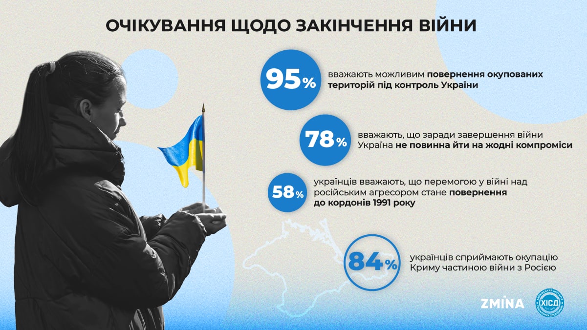 За даними опитування Харківського інституту соціальних досліджень, не сумніваються у поверненні всіх тимчасово окупованих територій України 89% громадян.