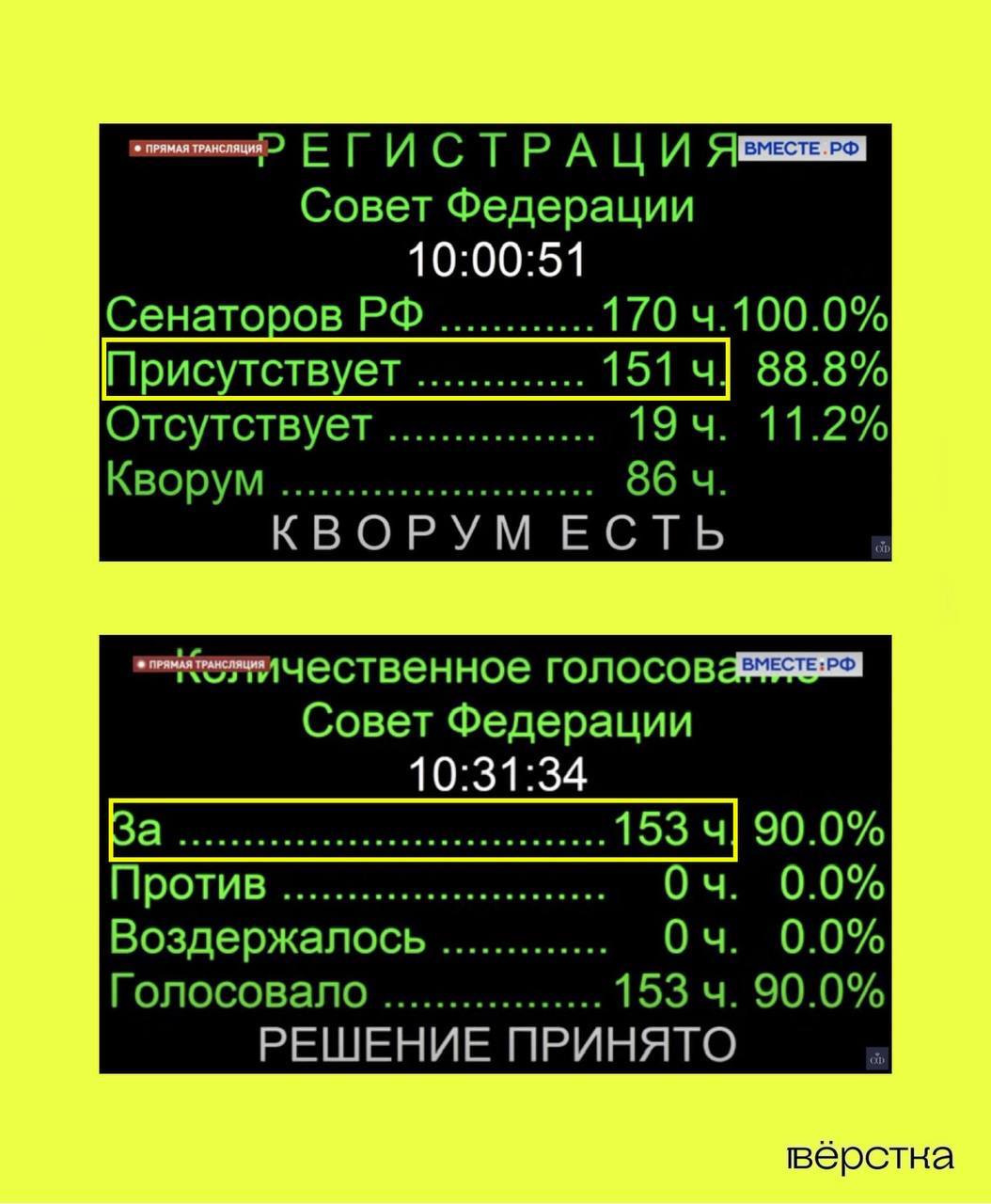 Хотя в начале заседания зарегистрировался 151 сенатор, в дальнейшем голосовании по законопроектам о "присоединении" новых территорий приняли участие уже 154 человека. Однако, согласно регламенту, перед началом заседания каждый сенатор должен получить карточку для голосования, которая регистрируется в электронной системе, а голосовать за других членов Совфеда ему запрещено.