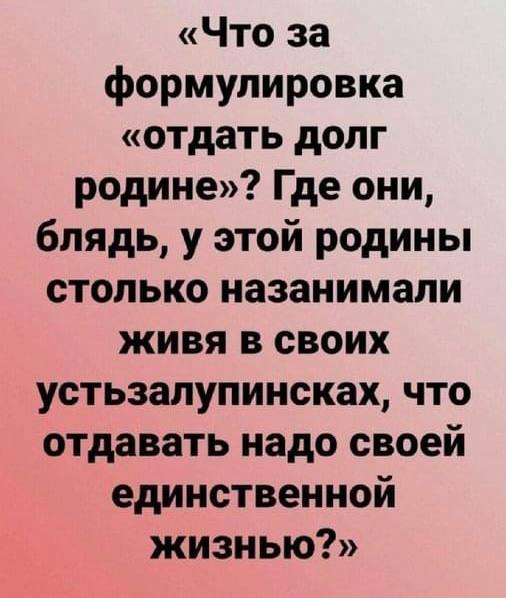 Это тоталитарный бред - внушение про неоплатный долг перед некой «родиной» (партией и правительством), который искупить до конца можно только либо вечным пресмыканием перед властью, либо смертью на какой-нибудь из ее бессмысленных войн.