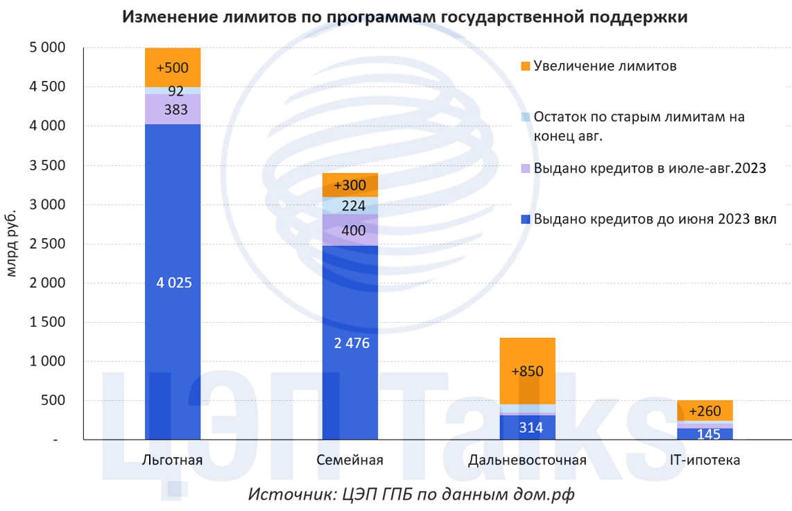 31 августа Правительство РФ увеличило лимиты: по льготной ипотеке с 4,5 до 5 трлн руб., по семейной - с 3,1 до 3,4 трлн руб., по IT-ипотеке c 240 млрд до 500 млрд руб. Наиболее сильно увеличился лимит по Дальневосточной ипотеке - с 450 млрд до 1,3 трлн руб., что было ожидаемо в связи с продлением программы до 2030 г.