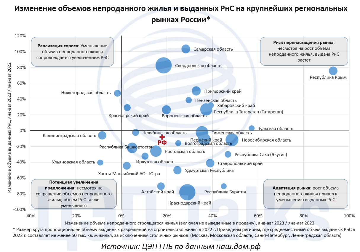 отреагировали - в том же Краснодарском крае объем выданных РнС за янв-авг 2023 г. снизился почти на 80% г/г. В других регионах есть риск перенасыщения рынка, так как, несмотря на рост доли непроданного жилья, растет и объем выданных РнС. Сохранение такой динамики будет оказывать сдерживающее влияние на рост цен на первичном рынке в этих регионах.