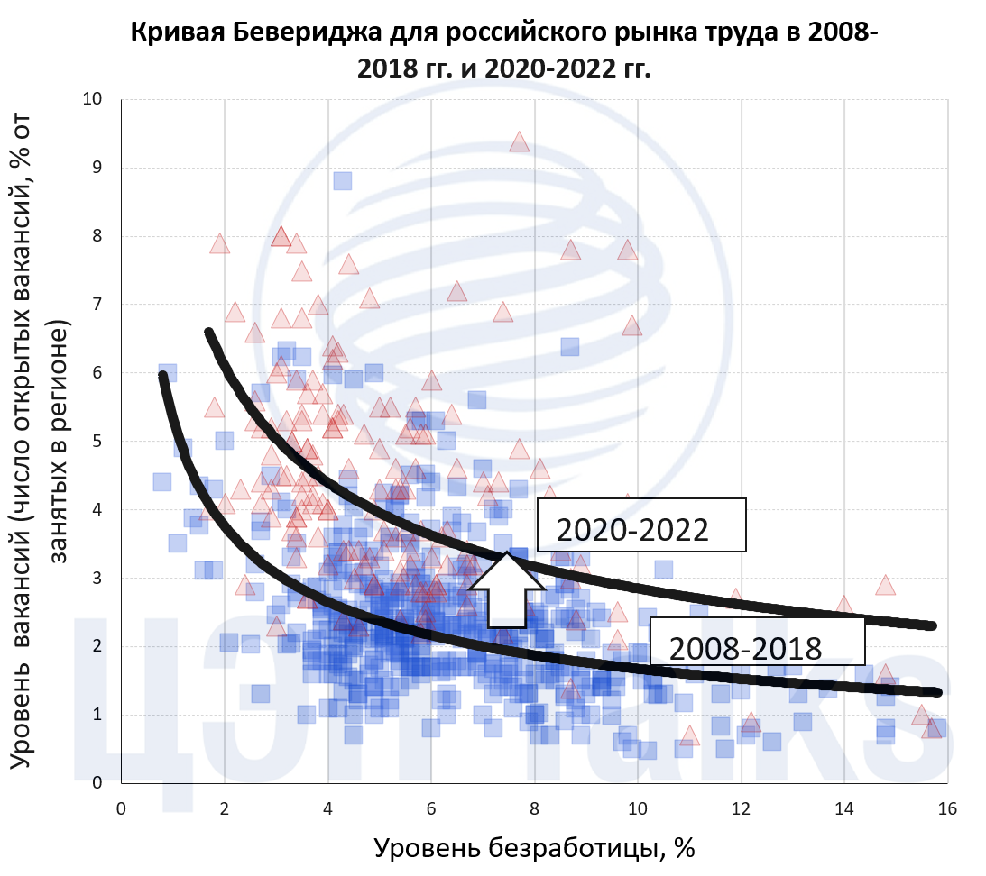Подобный сдвиг кривой происходит на российском рынке труда и может быть следствием структурных изменений: новые экономические условия привели к росту спроса на работников отдельных специальностей, в то время как предложение труда не может быстро подстроиться под этот спрос. В результате подобного дисбаланса издержки по найму сотрудников возрастают.