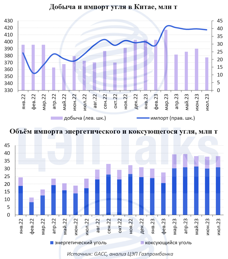 В июле КНР импортировала 39,3 млн т угля, причём за январь-июль 2023 г. импорт вырос на 89% г/г (261,2 млн т). Добыча угля за январь-июль достигла 2,67 млрд т (+3,6% г/г).