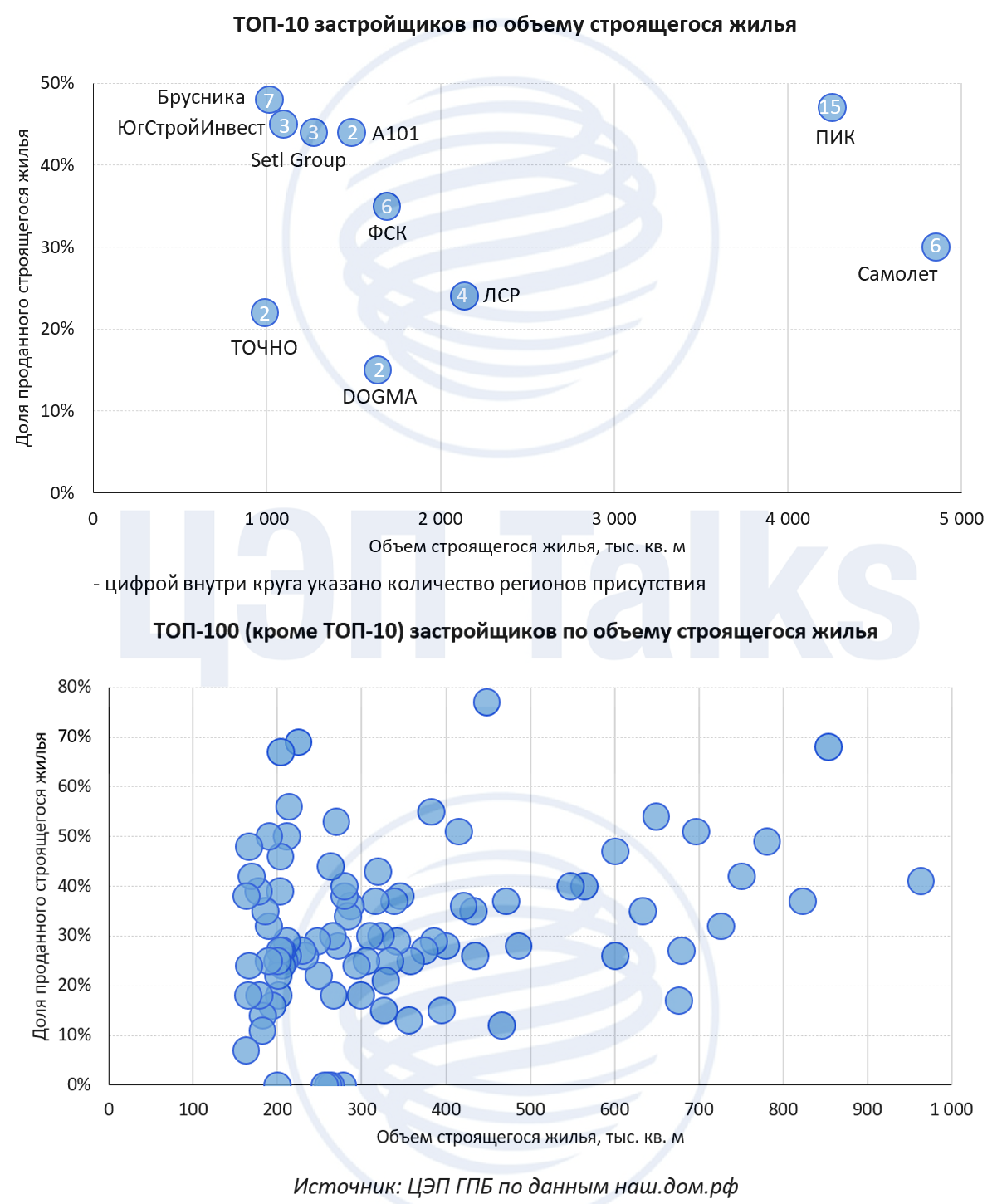 Впрочем, показатель объема жилья в стадии строительства зависит (со знаком +) как от количества недавно выведенных в продажу объектов, так и (со знаком -) от объема только что введенного в эксплуатацию жилья. И этот баланс по времени начала строительства связан с уровнем распроданности жилья. Крупнейшие застройщики по объему текущего строительства имеют больше возможностей управлять распроданностью портфеля, нежели менее крупные игроки, которые строят лишь несколько домов. Потому у застройщиков из ТОП-10 распроданность не превышает 50%, в большинстве случаев находясь в диапазоне 30-50%. А вот среди ТОП-100 существенно больше тех, у кого портфель строящегося жилья продан на 50-80% или наоборот менее, чем на 30%. За пределами ТОП-100 у 2/3 застройщиков распроданность находится вне диапазона 30-50%.