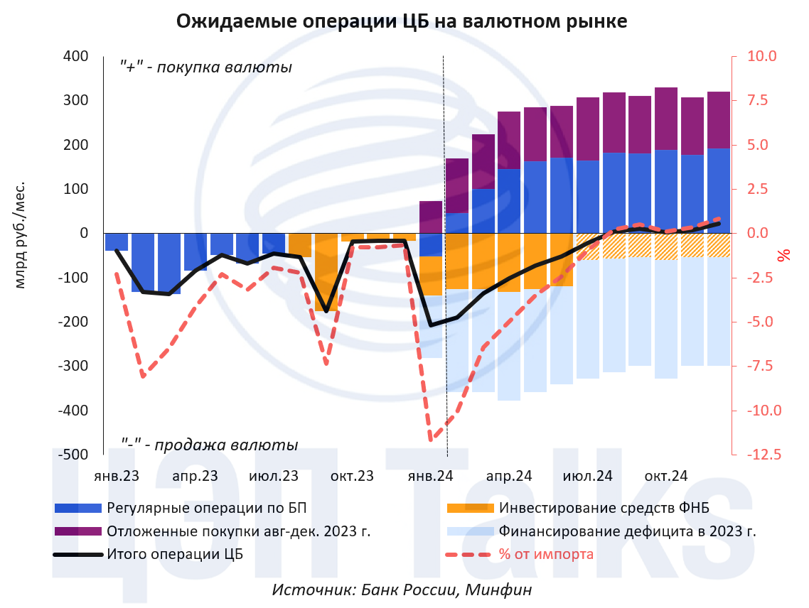 ▪️ 1 529 млрд руб. отложенных покупок с августа по декабрь 2023 г. будут реализованы равномерно в течение 2024 г. – по 6,2 млрд руб. в день