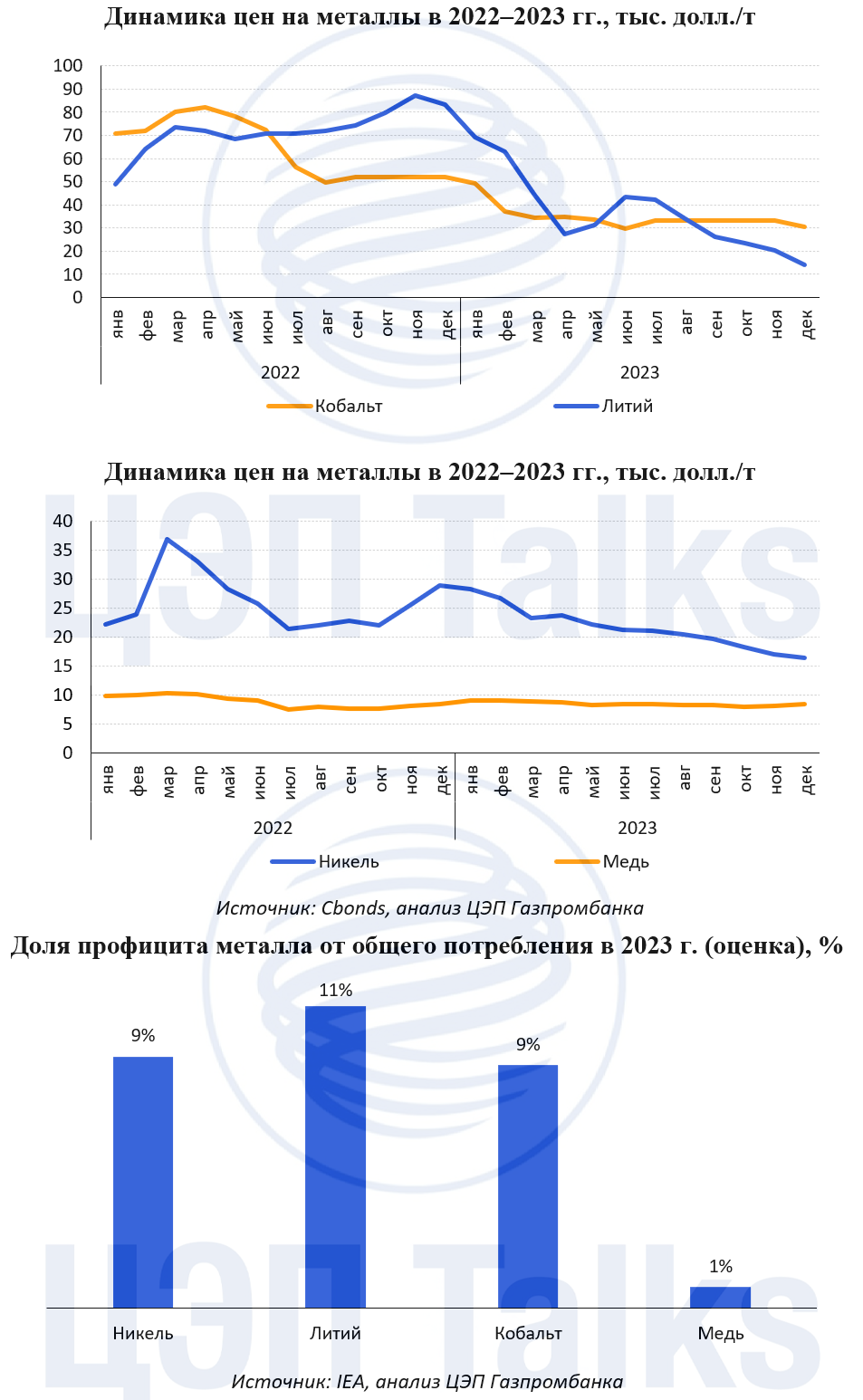 В 2023 г. цены на «батарейные» металлы снижались несмотря на бурный рост мирового производства аккумуляторов для электромобилей. «Зелёная» повестка вызвала высокий интерес к этим металлам (медь, никель, кобальт, литий) и рост инвестиций в добычные проекты. Это спровоцировало избыточный рост предложения металлов для аккумуляторов на рынке и, как следствие, образование профицита, который оказал существенное давление на цены. Так, например, цены на карбонат лития в 2023 г. упали на 80% до 14 тыс. долл./т, что является самым низким показателем с середины 2021 г. При этом образовавшийся профицит «новой нефти», в результате бурного роста предложения, в 2023 г. составил 11% к общему потреблению металла, при продолжающемся затоваривании складов литиевыми аккумуляторами.