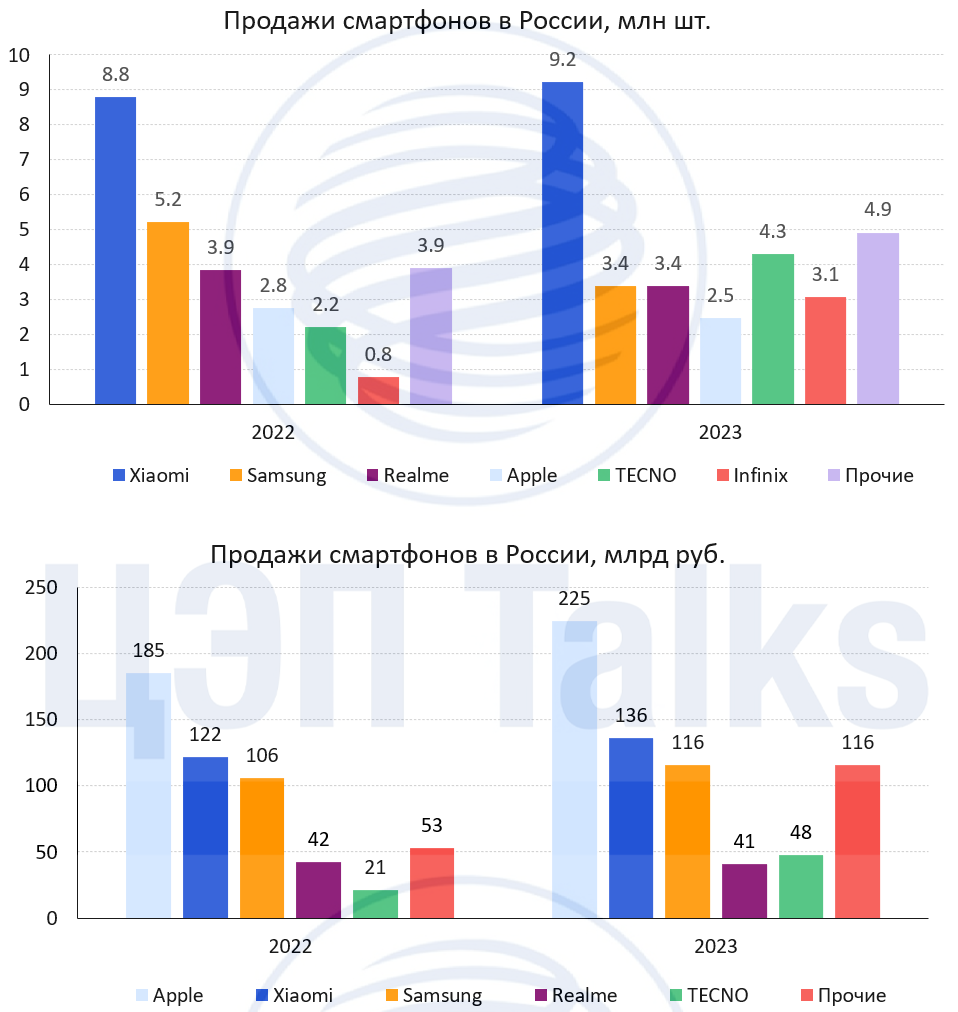 2. Tecno (14% рынка). За 2023 г. увеличили продажи в 2 раза до 4,3 млн шт. на сумму 47,7 млрд руб.