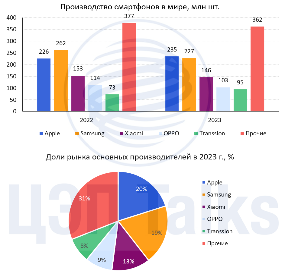 Согласно данным исследовательской группы International Data Corporation (IDC), в 2023 г. мировые поставки смартфонов сократились до 1,17 млрд штук (-3,2% г/г). Данный спад был вызван несколькими причинами: