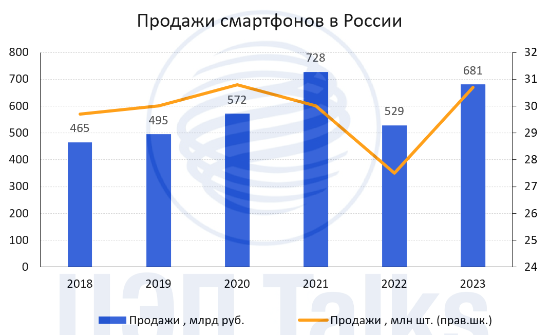 В отличие от мирового рынка продажи смартфонов на российском рынке растут. В 2023 г. в России было продано 30,7 млн шт. (+12% г/г) на сумму 681 млрд руб. (+29%). Основные причины роста следующие: