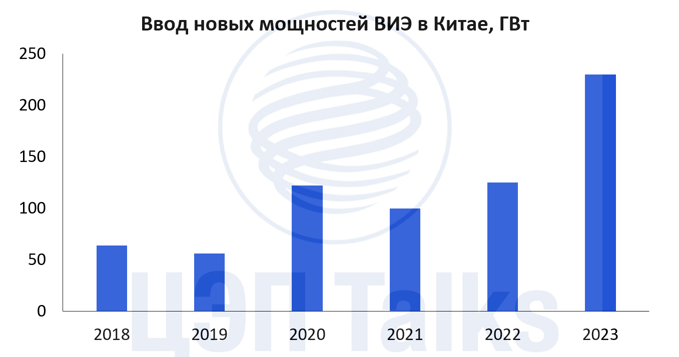 Китай за 11 мес. 2023 г. ввел в эксплуатацию 164 ГВт солнечной и 41 ГВт ветряной энергетики. По предварительным оценкам в 2023 г. состоялся рекордный ввод 230 ГВт мощностей ВИЭ (+84% г/г), что сопоставимо с мощностью всей энергосистемы России (234 ГВт в 2022 г.). Также этот показатель в 2 раза превышает суммарный ввод мощностей возобновляемой энергетики в ЕС и США в 2023 г.