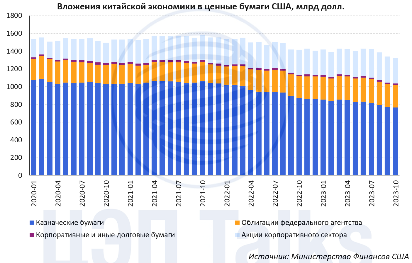 Эта тенденция хорошо прослеживается с окт. 2021 г. В 2022 г. сокращение вложений в трежерис составляло в среднем 14,5 млрд долл. в месяц, в 2023 г. динамика снизилась до 9,7 млрд долл. в месяц. Традиционно считающиеся безрисковыми активами казначейские бумаги США в портфеле ЗВР Китая уже опустились ниже уровня 2010 г., достигнув 765 млрд долл. (окт. 2023 г.).
