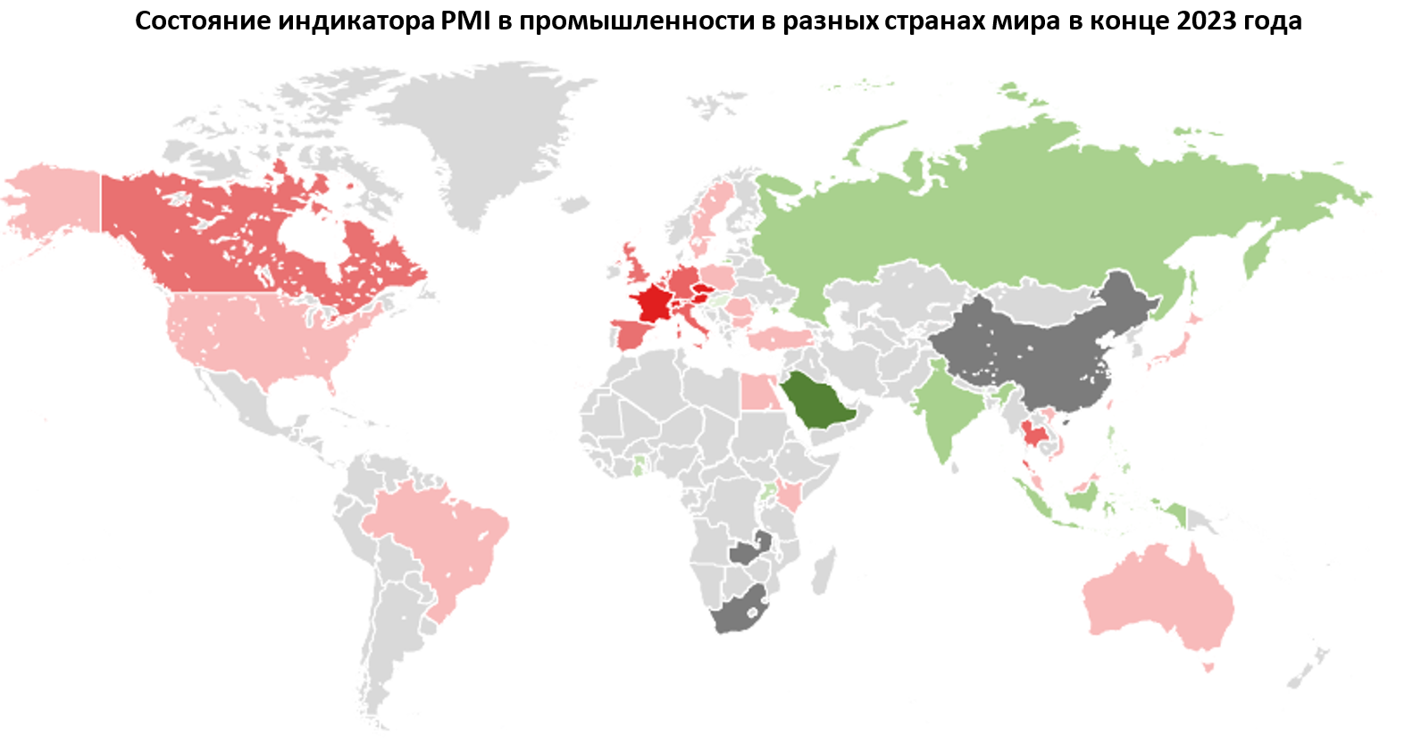 Яркая иллюстрация части этих рисков ― текущее распределение стран по индексу PMI в промышленности, рисунок ниже (индекс PMI отражает настроения экономических агентов по перспективам деловой активности).