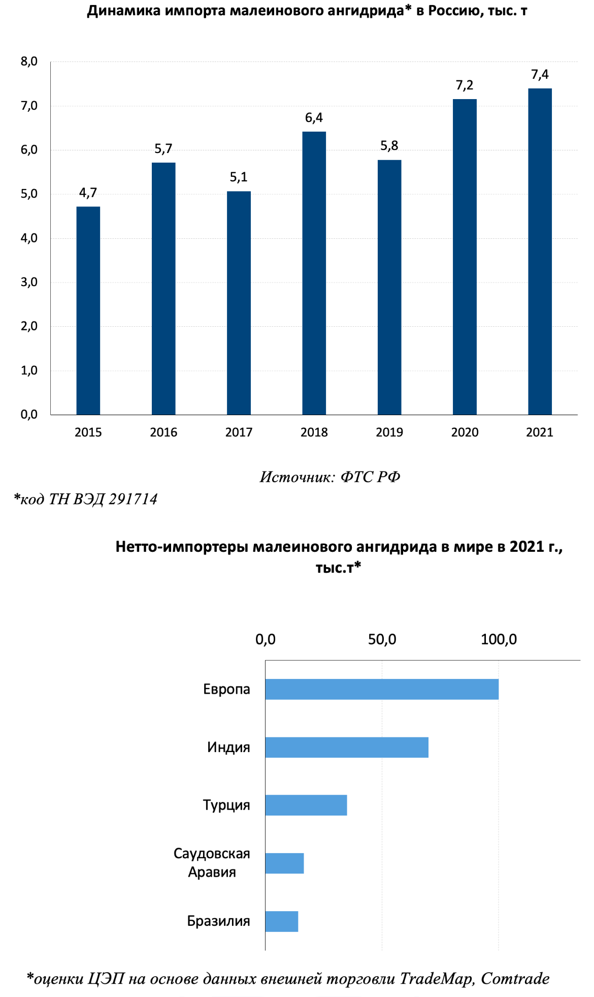 Малеиновый ангидрид – сырье для производства полиэфирных смол, лакокрасочных и отделочных материалов на их основе. Производные малеинового ангидрида используются в выпуске агрохимикатов и фармацевтических препаратов. До недавнего времени спрос на малеиновый ангидрид в России удовлетворялся исключительно за счёт импорта, который в 2021 г. составил 7,4 тыс. т (12 млн долл.). Помимо этого объема, много малеинового ангидрида фактически ввозилось в Россию в составе сополимерных материалов и композиций.