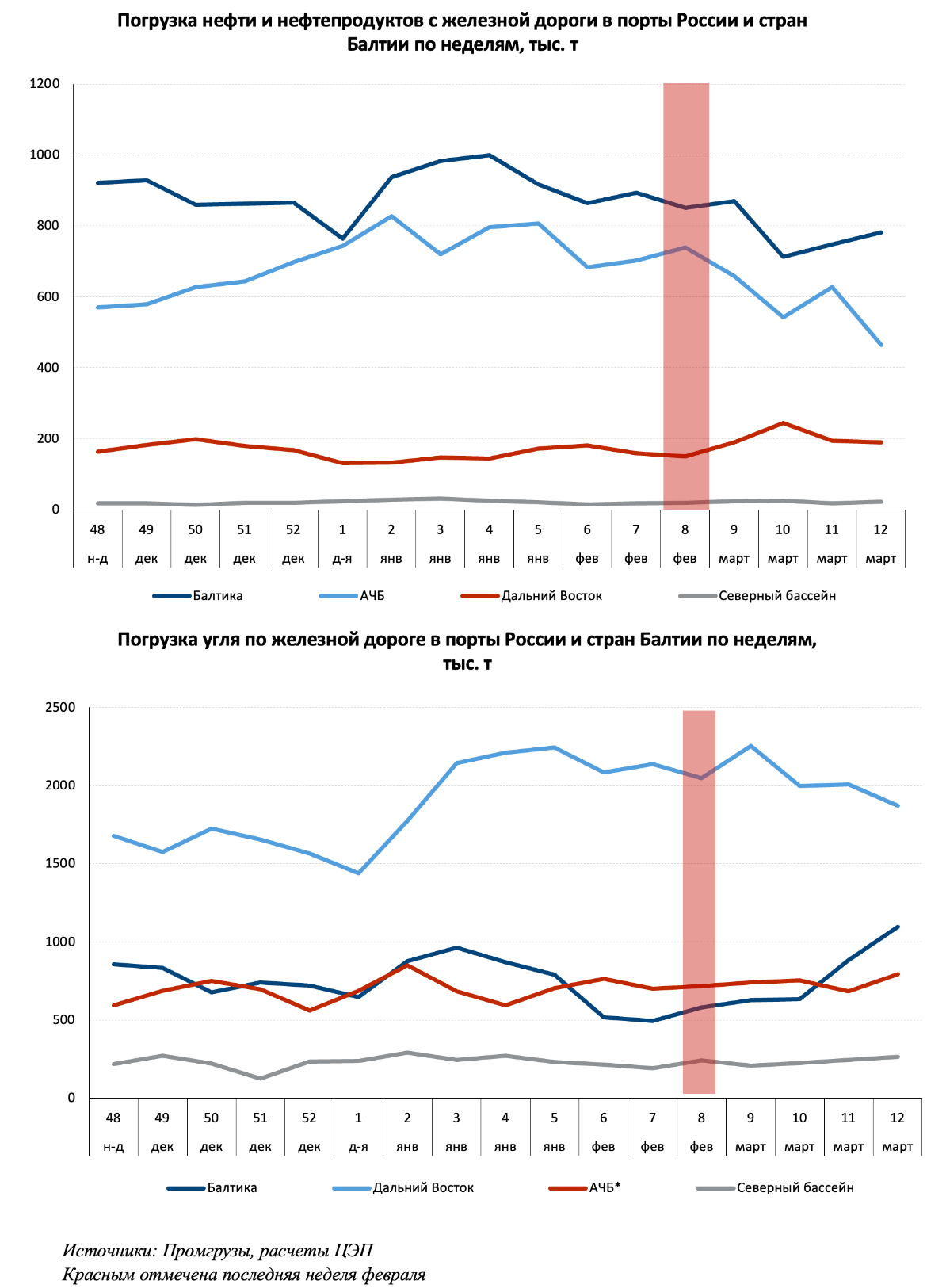 Поставки нефти и нефтепродуктов по железной дороге в порты России и Прибалтики за последние четыре недели (с 28 февраля по 27 марта) снизились на 12% по сравнению с предыдущими 4-мя неделями. Поставки нефти и нефтепродуктов по железной дороге через порты Дальнего Востока выросли на 23%, а поставки в направлении портов Балтики и Азово-Черноморского бассейна (АЧБ) – упали на 12% и 22% соответственно.
