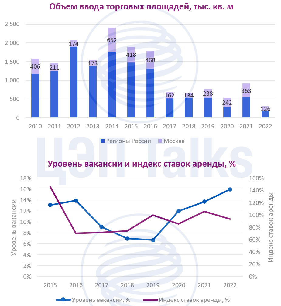 За 2022 г. в Москве было введено 126 тыс. кв. м торговых площадей, в регионах – 179 тыс. кв. м, что ниже аналогичных показателей за 2021 г. на 65% и 67% соответственно. Рынок качественных торговых центров продемонстрировал такую динамику за счет трех факторов: