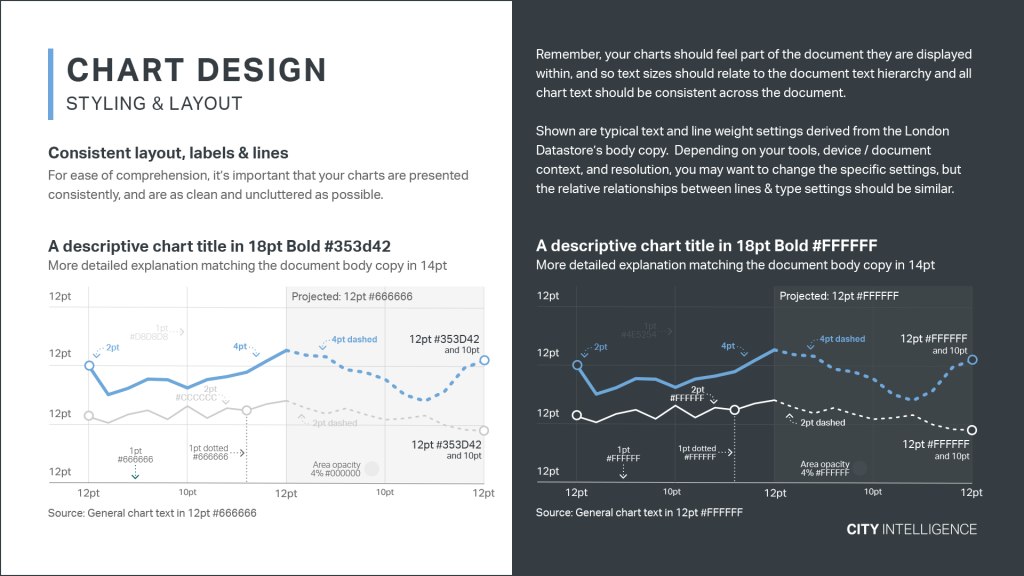 Такие организации, как Google и London City Intelligence, недавно расширили свои системы проектирования, включив стандарты, специально предназначенные для визуализации данных. Это говорит о растущей важности использования данных и показателей при принятии решений в организации и о ценности их надлежащего брендинга.