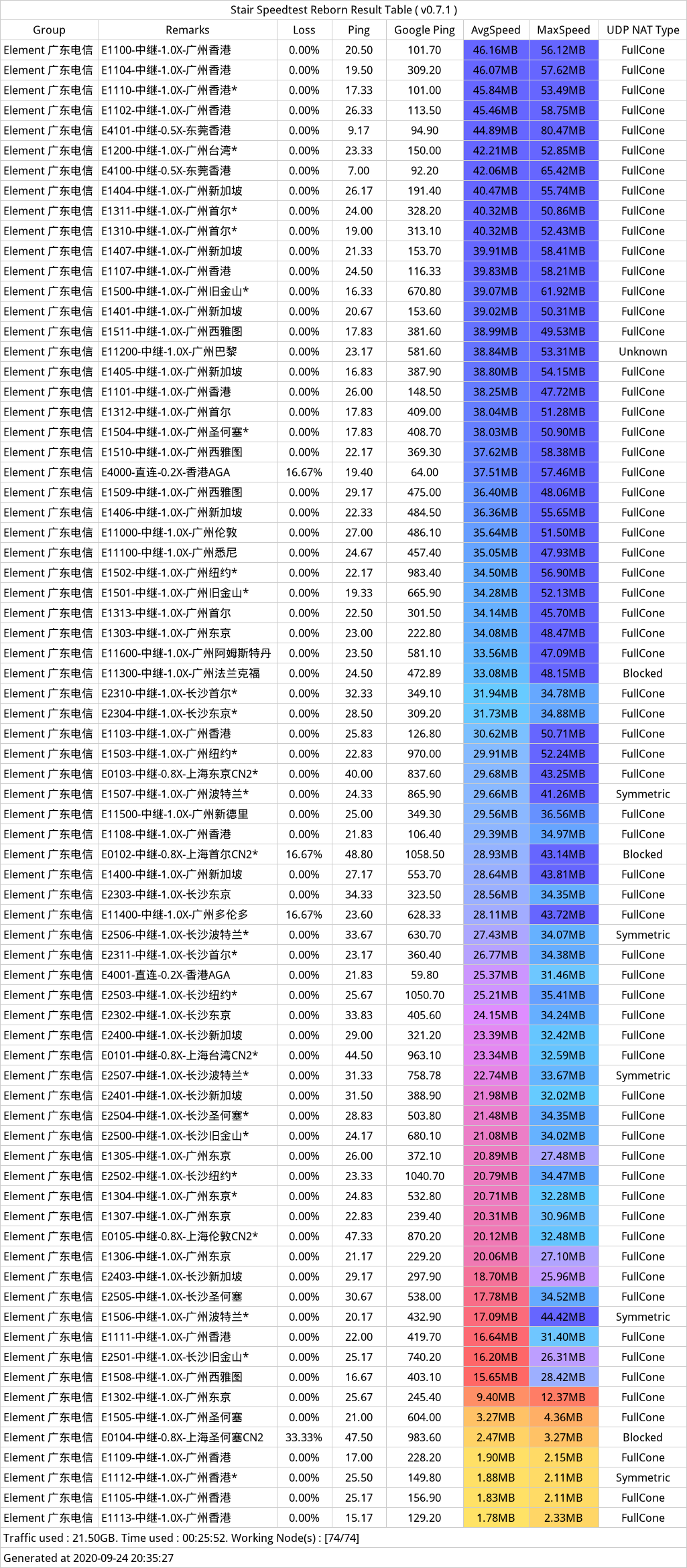 ,晚高峰测速,测速环境:广东电信500mbps&湖北电信500mbps,速度和延迟都挺不错,最近准备上线专线节点。