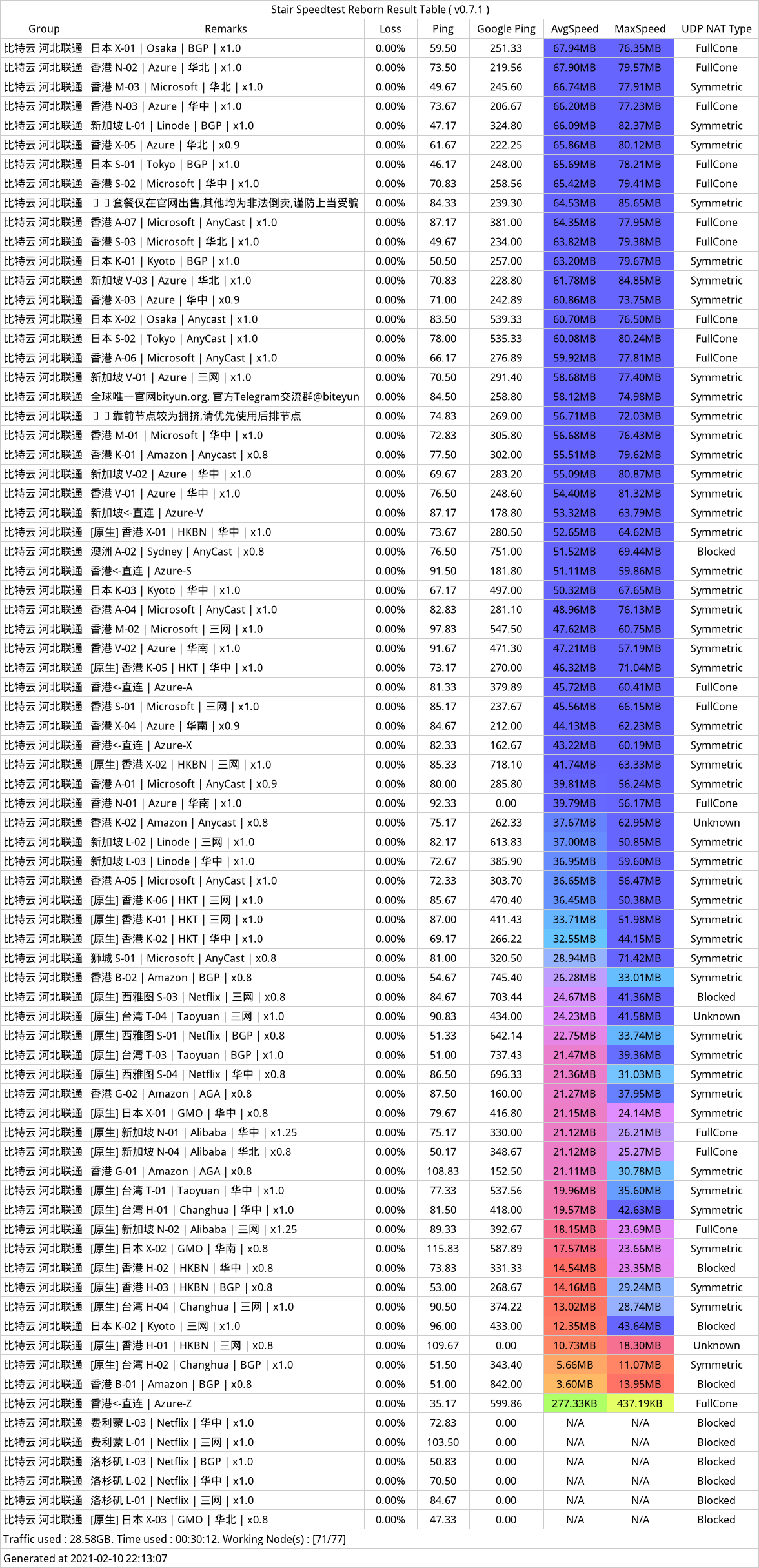 #苏打不甜 #vmess,晚高峰测速,测速环境:河北联通500mbps,基本全原生节点。