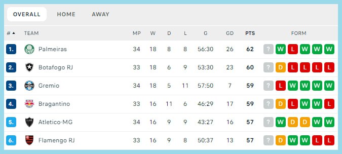Палмейрас за то же время набрал 15 очков в 6 матчах — и вывалился на первую строчку с опережением в 2 очка. Тут и Брагантину с Гремиу подтянулись. Единственный нюанс: у Ботафого запасная игра, которая теоретически можно вернуть их на первое. Но после лидирования в 9 очков выглядит печально.