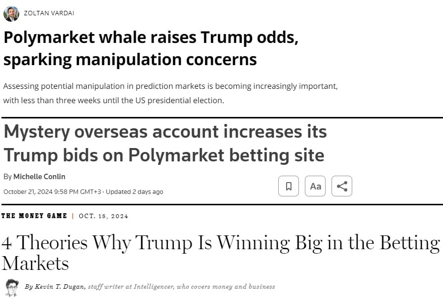 Во-вторых, СМИ нашли связь между его постами и резкими изменениями в коэффициентах на кандидатов — Трамп падает сначала на Polymarket, затем линию двигают обычные букмекеры.